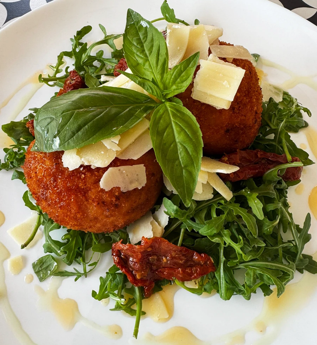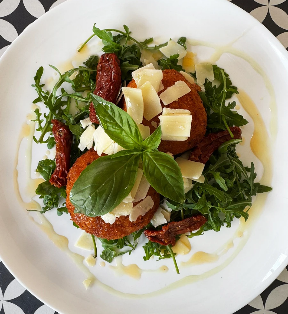 Roquette, aubergines grillées, tomates séchées, huile d'olive, basilic.
