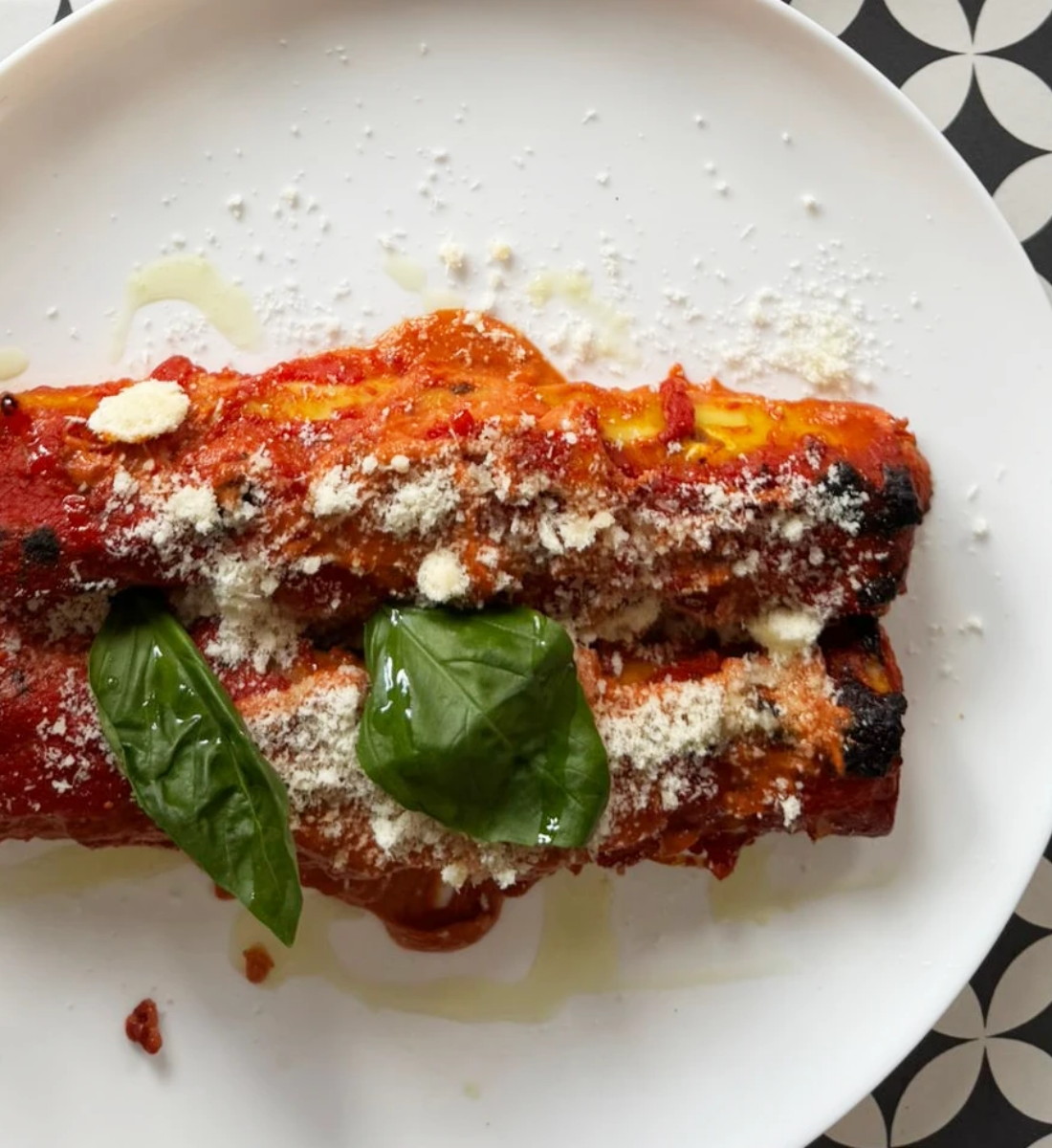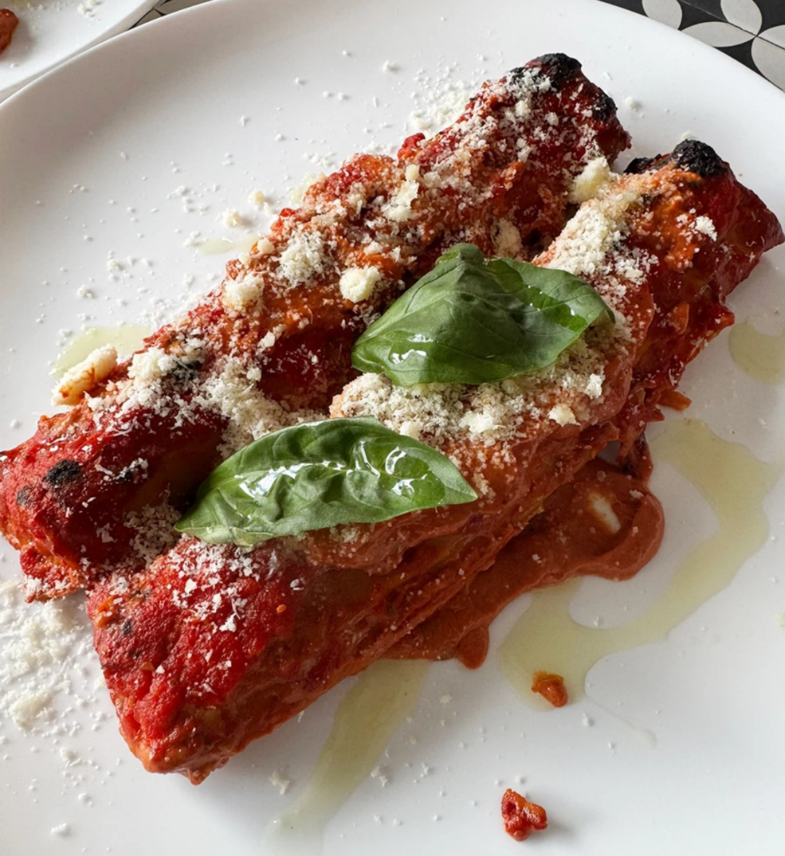 fiordilatte mozzarella, salami calabrais, ricotta, sauce tomate, pecorino, huile d’olive, basilic
